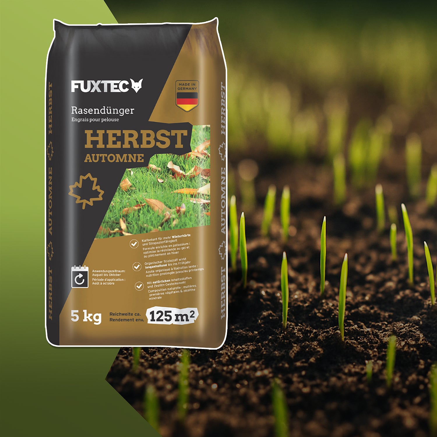 Während der Wachstumsphase fügst Du dem Rasendünger und Unkrautstopper zu. So werden und bleiben die Halme robuster, d. h. also in der Saison von April bis Oktober am besten etwa alle 6 bis 8 Wochen Dünger zufügen. Diesen erhältst Du ebenfalls bei FUXTEC, optimal auf die Rasensamenmischungen abgestimmt. Siehst Du Anzeichen von gelb-rötlicher Färbung der Grashalme, so fehlt meist Stickstoff. Dünge in diesem Fall umgehend. Auf die richtige Dosierung kommt es wie bei der Bewässerung auch beim Düngen an: Zu wenig und der Rasen ist nicht robust, zu viel und Du schaffst optimale „Brutbedingungen“ für Krankheiten und Schimmel. Das Entfernen toter Grashalme, das Vertikutieren, ist ebenfalls ein wichtiger Pflegeschritt, um die Rasenfläche üppig und schön zu halten. Dafür verwendest Du einen Vertikutierer. Tote Halme, Unkraut und Moos werden damit entfernt. Übrig bleibt ein gesunder und gut durchlüfteter Rasen und ein schöner Garten.
