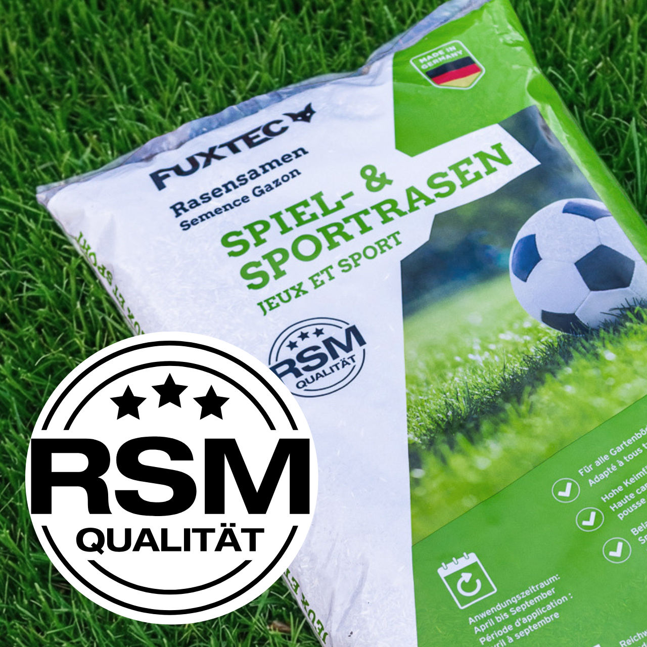 Regelsaatgut (RSM) ist ein Standard in Deutschland, der garantiert, dass Deine Rasenfläche eine definierte Qualität und Zusammensetzung hat. Eine Rasenmischung mit RSM‑Kennzeichnung enthält geprüfte Gräser, sodass Grassamen optimal keimen und gedeihen.