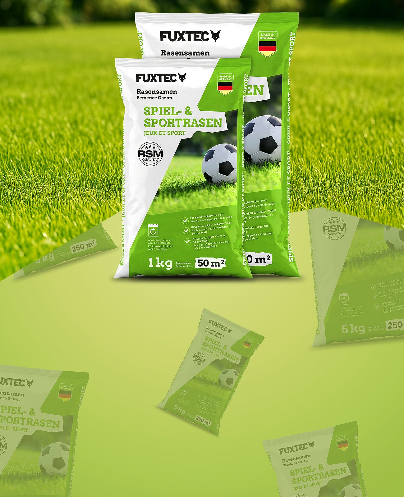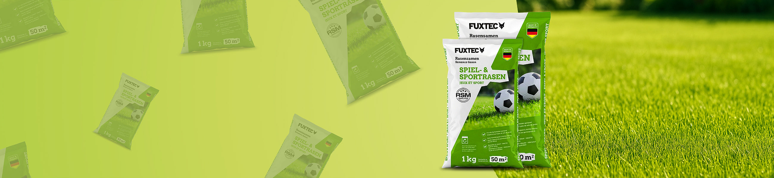 Mit FUXTEC Rasensamen verwandelst Du kahle Stellen und müdes Grün in einen dichten, gesunden Rasen. Schon nach wenigen Wochen sind die Ergebnisse klar zu sehen.
