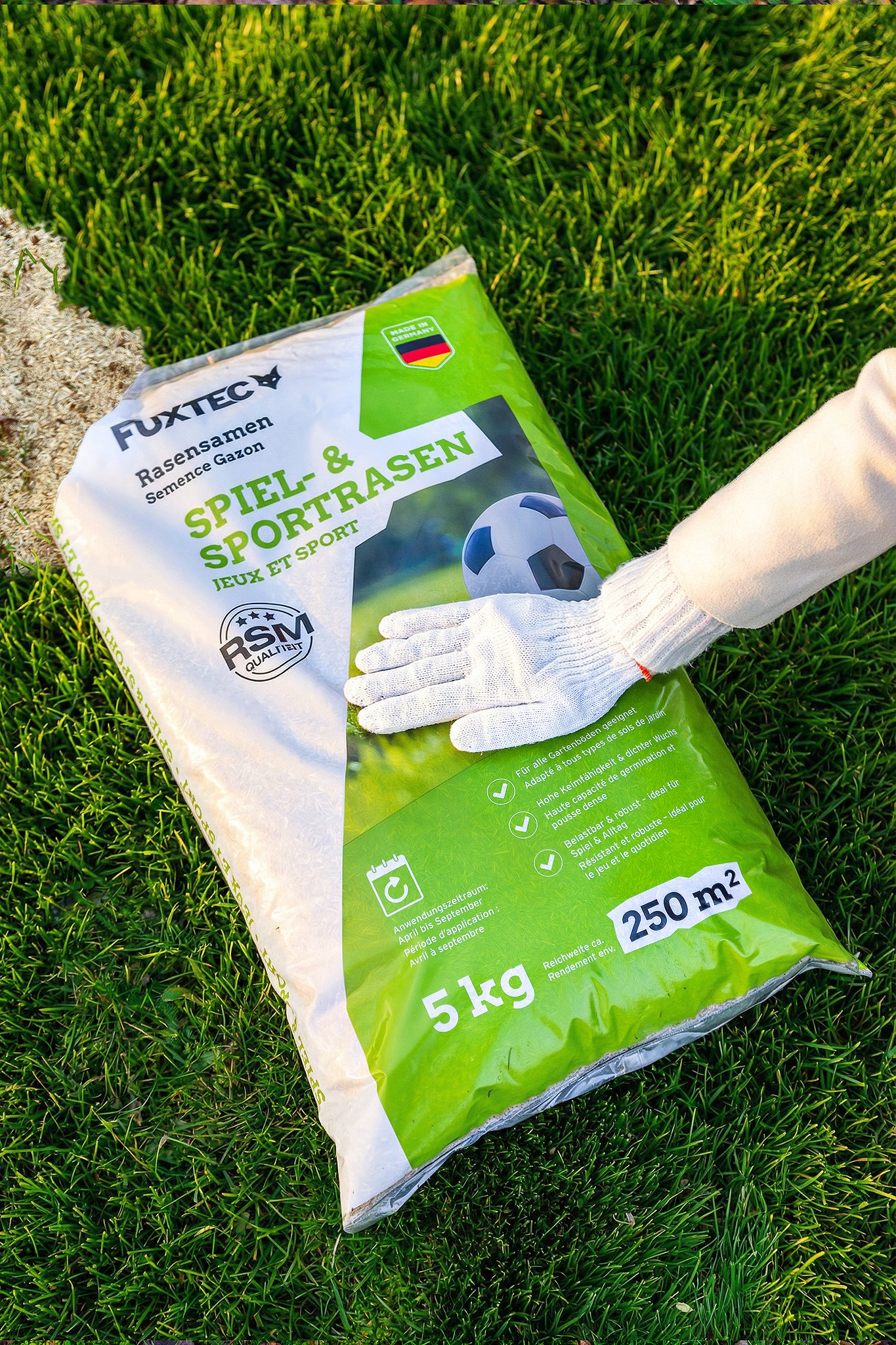 - Für Reparaturen und Nachsaat: Nachsaatmischung (z. B. FUXTEC FX-RSNR1)