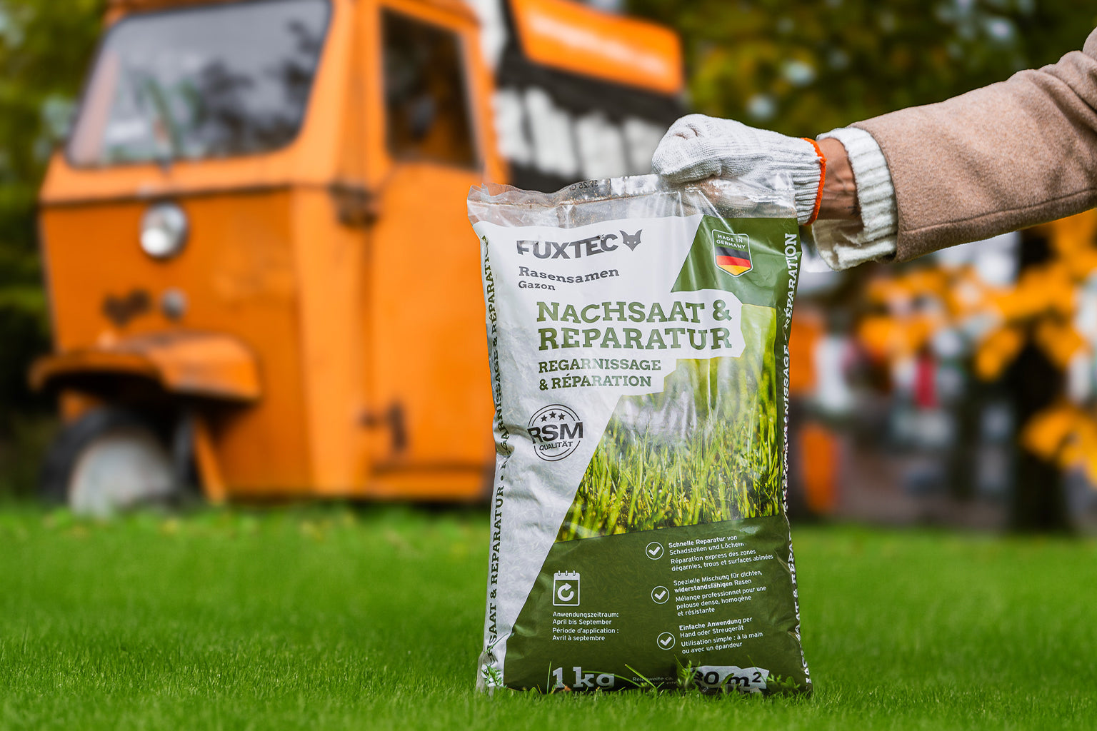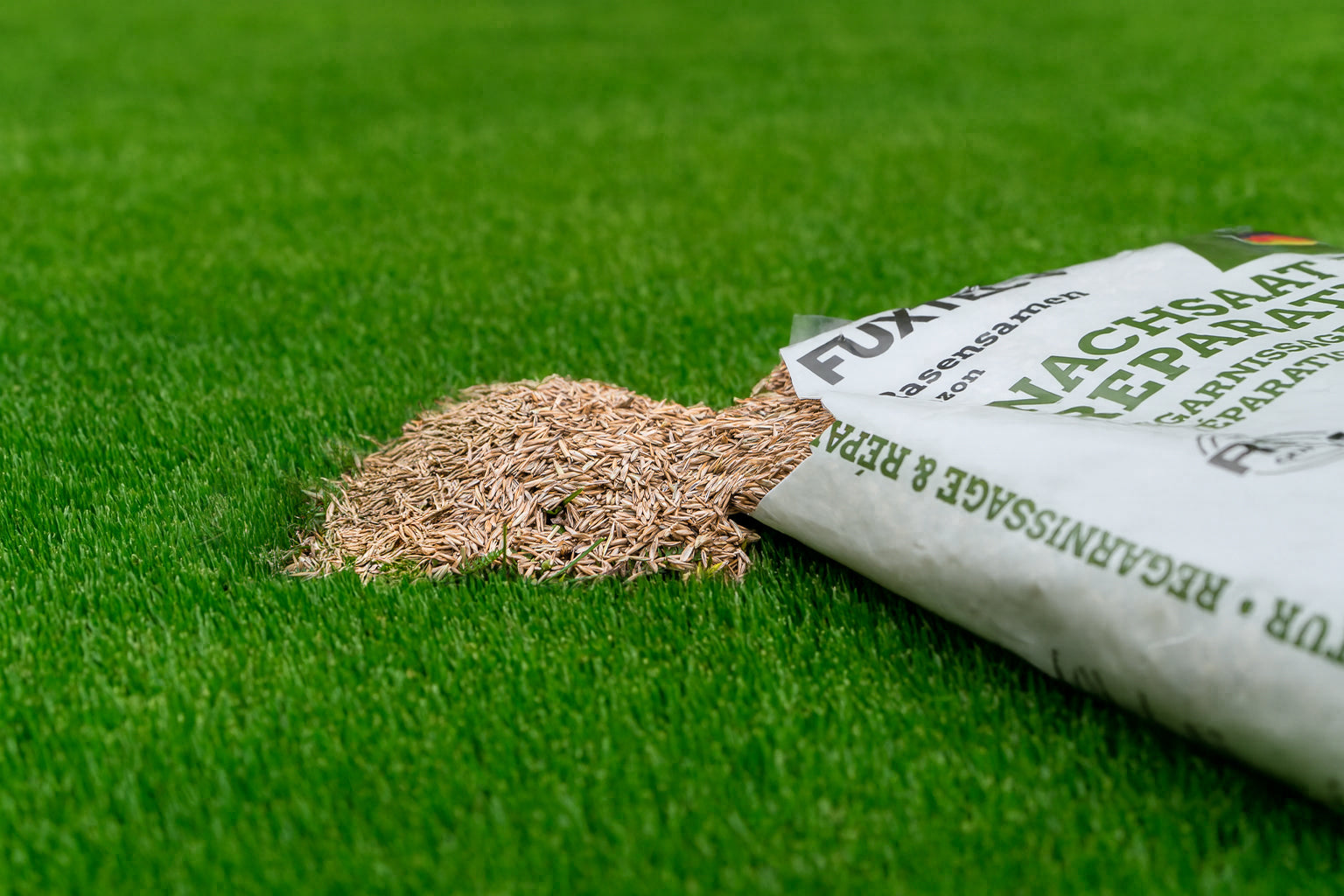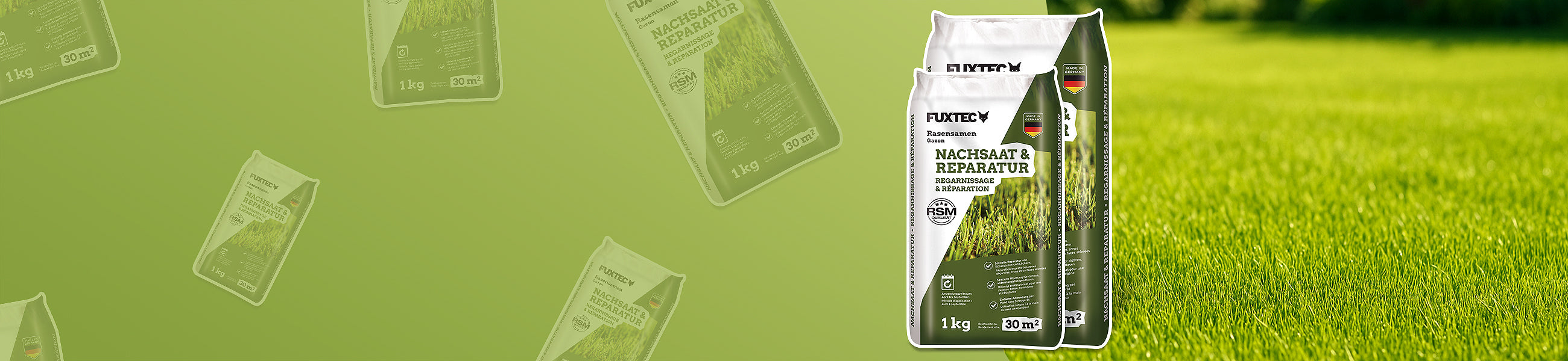 - Für Reparaturen und Nachsaat: Nachsaatmischung (z. B. FUXTEC FX-RSNR1)