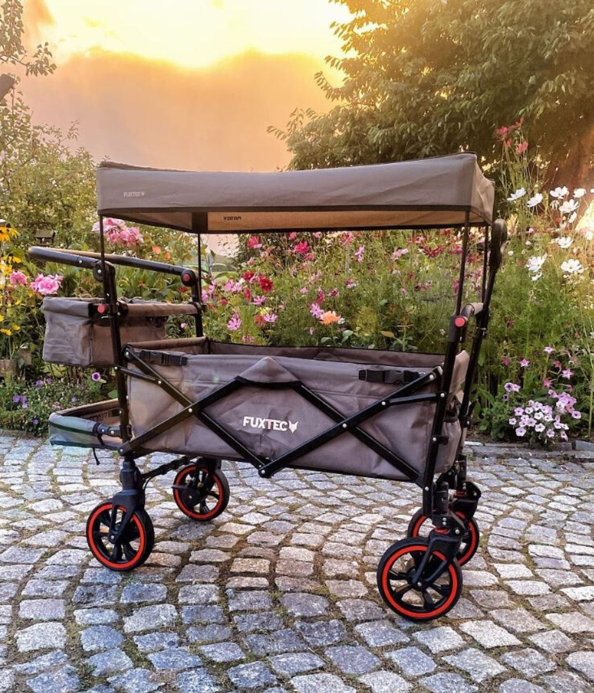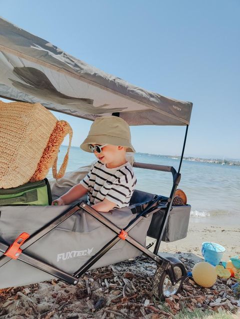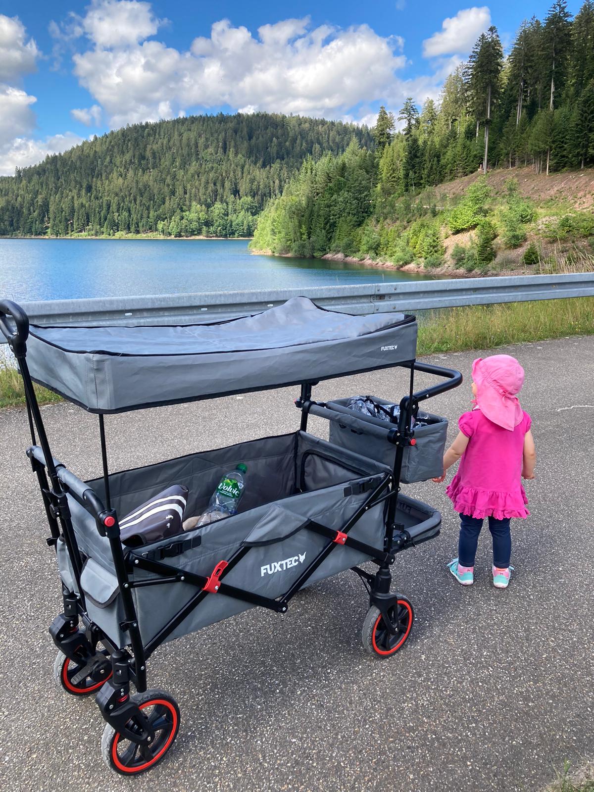 Kein herkömmlicher Bollerwagen wie jeder andere, sondern vom TÜV Süd explizit zur Beförderung von Kindern zertifiziert.