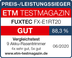 Der FUXTEC FX-E1RT20 wurde vom ETM TESTMAGAZIN im Vergleichstest von 9 Akku-Rasentrimmern mit der Note „GUT“ (88,3 %) ausgezeichnet.