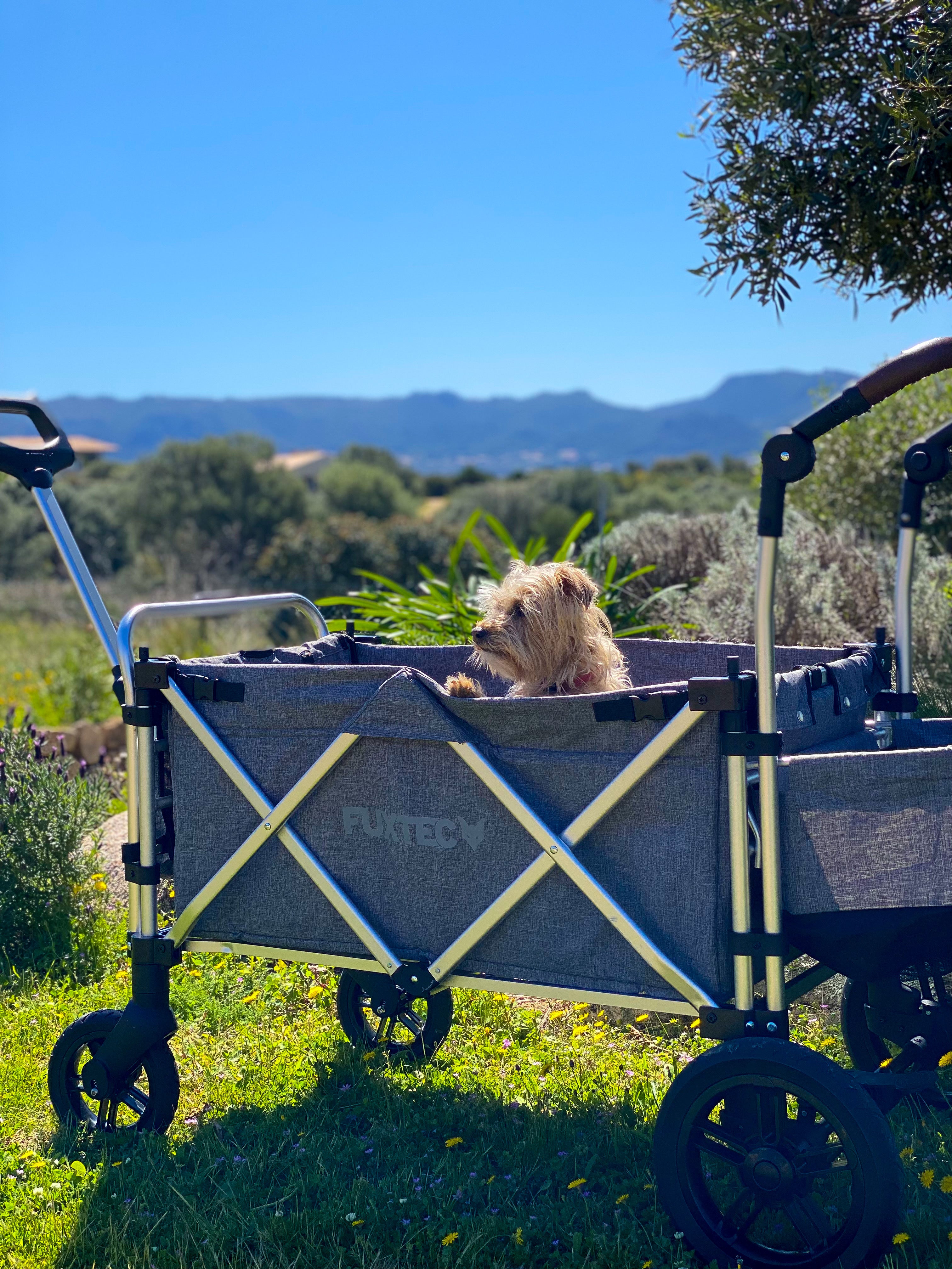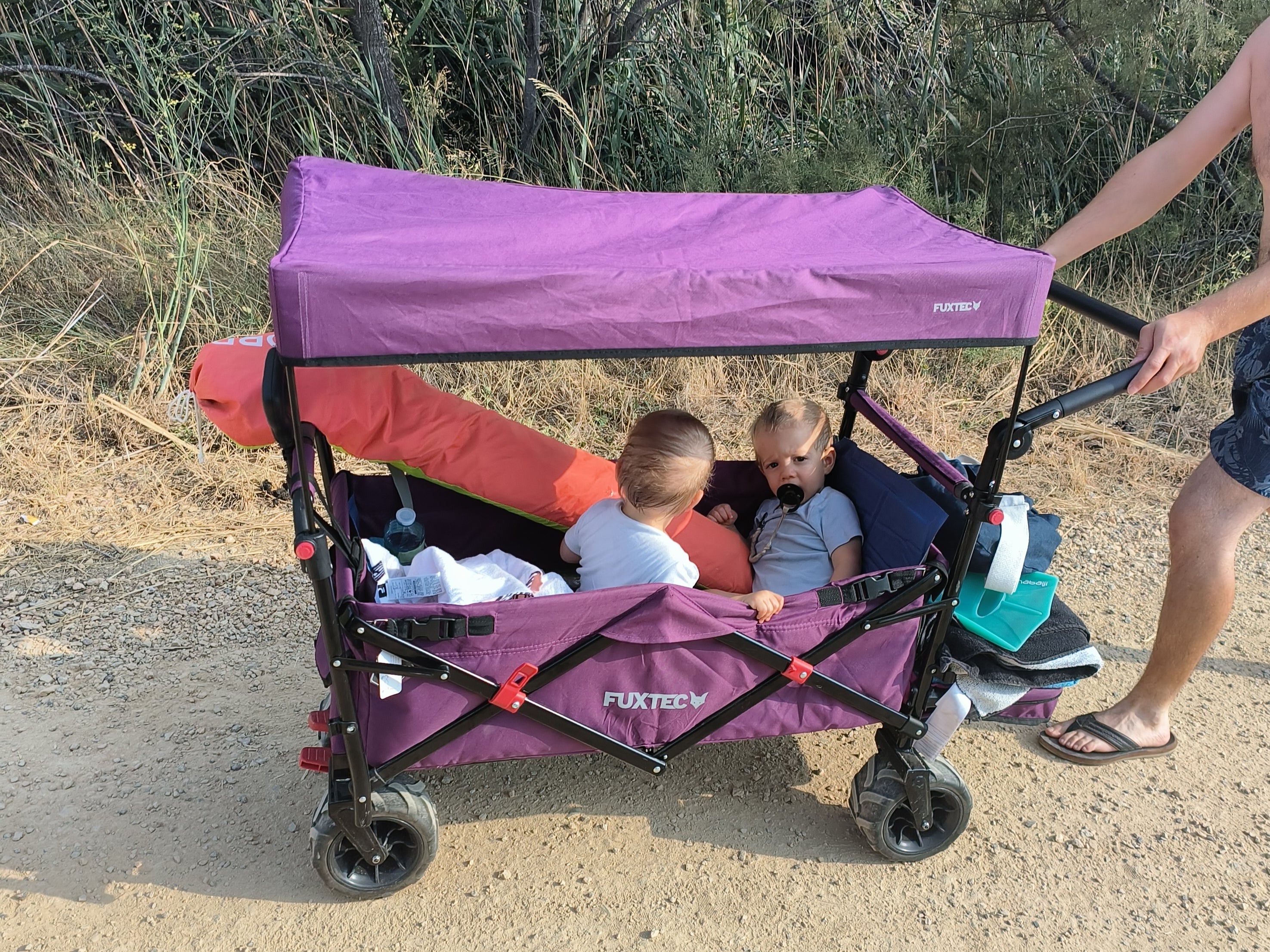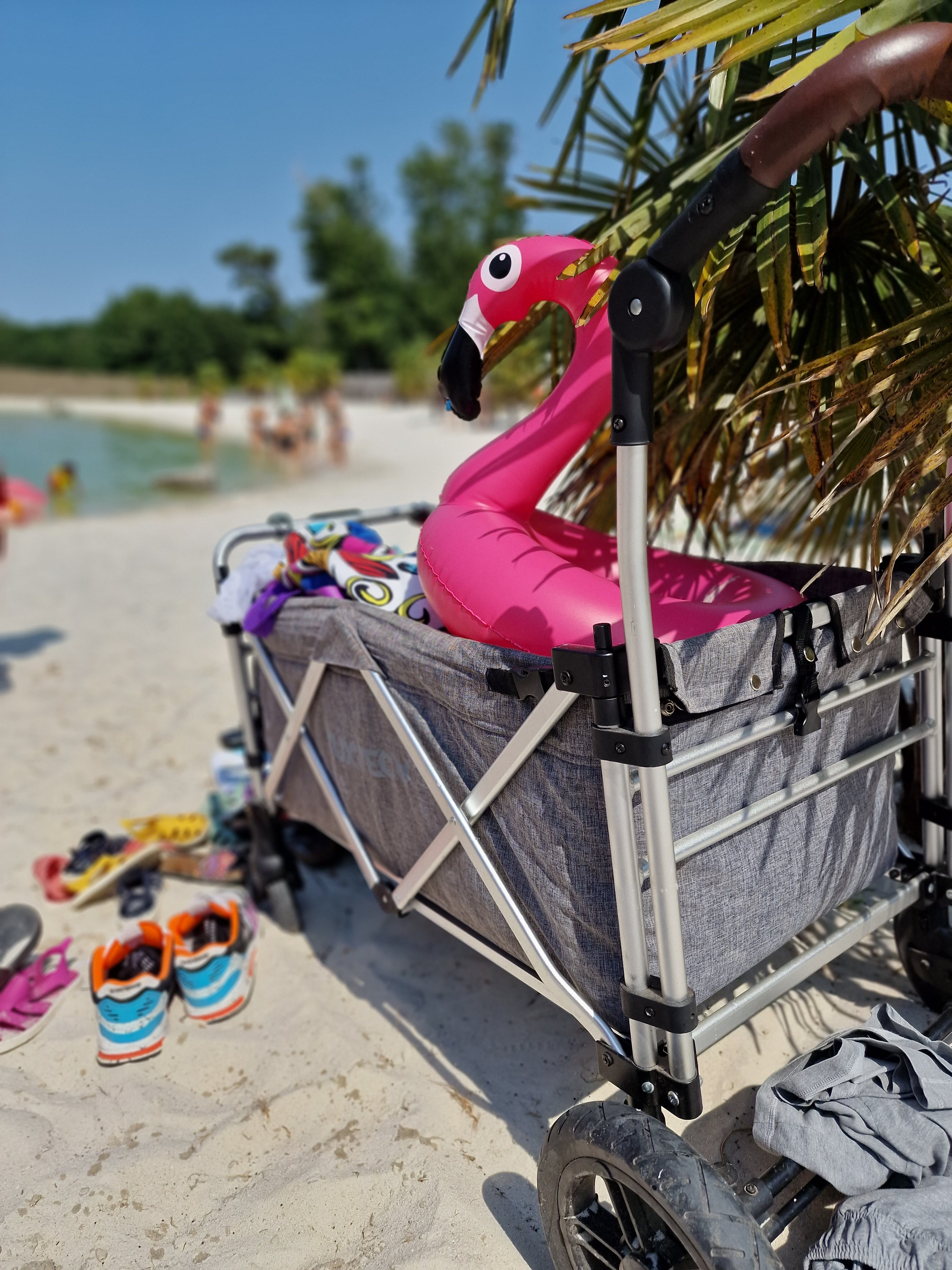 Ein Bollerwagen mit großem Packvolumen ist ideal. Vollgummi- oder Luftreifen sorgen dafür, dass er sich nicht festfährt oder im Sand einsinkt. Mit einer höhenverstellbaren Zugstange ist er gut manövrierbar und eine Feststellbremse bietet Sicherheit. Ein Sonnendach mit UV-Schutz und witterungsbeständige Materialien schützen vor Sonneneinstrahlung und Regen. Besonders leicht zu verstauen sind faltbare Wagen, wie der FX-CTB800.
